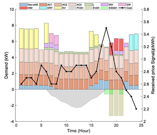 DERs are essential in developing active customers with the potential to engage in the local energy market and, hence, are integrated into the HEMS-DR program. This case emphasizes the DR algorithm’s benefits by utilizing assets such as PVs, ESSs, and EVs. The energy offered by the household assets (PV, EV, and ESS) is used to minimize consumption from the grid and balance the demand/generation relationship. It is assumed that PV-to-home (PV2H), ESS-to-home (ESS2H), and EV-to-home (V2H) capabilities are available. These assets may also be used to sell energy to the grid via PV-to-grid (PV2G), V2G, and ESS2G options. Figure 6 presents the results of this case, and the following are observed: