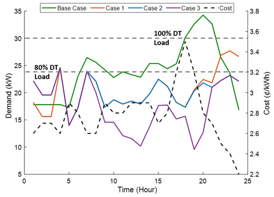 The DR algorithm overcomes this issue by including the LoL as a transformer deterioration cost using (5). Figure 5 shows the Case 2 optimized scheduling for the household load after adding LoL cost. It can be noted that the EV charging load is shifted to slots 1:00–3:00 of high electricity price compared to slots 22:00–24:00 used in Case 1. While this load shift may increase the electricity cost, it satisfies the LoL cost and overcomes the distribution transformer’s overload condition and other assets. Case 2 results in a peak demand reduction of 18% compared to Case 1, positively impacting the utility assets. The new load profile of Case 2 has an electricity cost of USD 4.7, which is higher than Case 1; however, it is lower than the base case by 23% and provides direct benefits to both the end-user and utility operator.