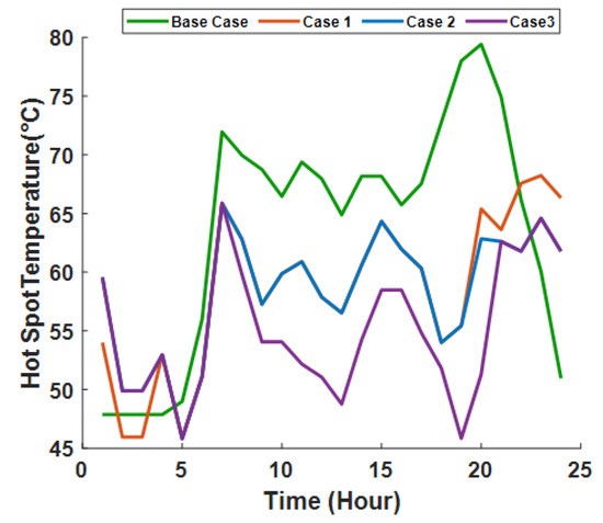 In this case, the objective function of transformer LoL mitigation cost is considered along with operation cost (), as presented in Equation (2), and customer discomfort cost (). The HEMS implements an approach to fulfill the consumer’s expectations and decreases the transformer’s LoL by monitoring transformer load, electricity price, HST of distribution transformer, and predicted consumption pattern of the customer. The DR program’s impact on a 30-kVA distribution transformer based on the IEEE standard C57.91-2011 is used to investigate its loss-of-life cost. The transformer is assumed to be supplying three houses where their household loads are monitored and controlled by the proposed DR algorithm. Based on Case 1, the transformer has a peak demand in lower-price slots as the DR algorithm operates all the smart appliances in these periods. Therefore, the load and LoL factor during these periods increased compared with the reference case’s low-price periods.