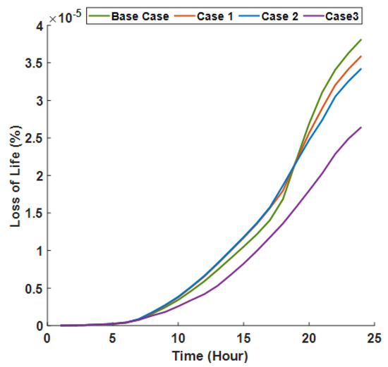 The objective, in this case, is to minimize the total daily operation cost considering the CDC () and ignoring the transformer LoL cost in Equation (2). The customer comfort level is reflected in the optimization algorithm, considering the parameter, as illustrated in Table 1. Figure 4 shows the aggregated household load along with the electricity price signal after participating in Case 1. The proposed DR algorithm attempts to optimize energy consumption and achieve the lowest electricity charge cost. Specifically, all active loads (controllable and shiftable loads) are scheduled to operate outside electricity high-price slots. The controllable loads are scheduled to consume less energy from 15:00 to 20:00 and consume more energy between 1:00 and 8:00 and 21:00 and 24:00. The shiftable loads (DRY and WM) are scheduled to operate at 23:00 and 24:00, where the electricity price is low. The DW remains operating in slots 7 and 8 as it is the lowest in its working period, as specified in Table 1. The DR algorithm reduced the operation cost by scheduling the EV charging in the lowest price slots (22:00–24:00 and 4:00) during the time that EV is at home.