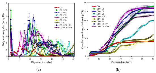 As can be seen from Figure 1b, the variations of cumulative methane yield over time presented a “stable–rising–stable” trend, showing sigmoidal curves, except for the CD + SL group, CD + TL group, and CD + VI group. The curves of cumulative methane yields of CD + SL and CD + TL groups included multiple “stable–rising” stages. The curve of the CD + VI group presented a phased upward trend. The cumulative methane yields of CD + CS group were highest, followed by the CD + WR and CD + GL groups, which were 2.37, 2.25, and 2.23 times higher than that of the control group, respectively. The cumulative methane yield of the control group was lowest. According to the daily and cumulative methane yields, it was found that anaerobic co-digestion increased the cumulative methane yields by increasing the maximum daily methane yields and expanding the period with high yields.