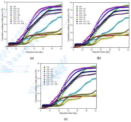 The cumulative methane yields obtained from the anaerobic co-digestion experiments were fitted using the modified Gompertz, logistic, and Richards models (Figure 2). The comparison between fitting results obtained from the modified Gompertz model and experimental results is shown in Figure 2a. As can be seen from the data in Table 3, the R2 values were all greater than 0.9, which showed the good fitting results of the modified Gompertz model in expressing the accumulative process of methane yields. The highest R2 values were obtained in the CD group. The R2 value of the CD + TL group was the lowest.