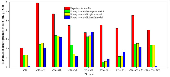 Figure 4 shows the differences between the experimental values and the fitting values of Rmax. The results showed that the fitted Rmax values of the three models were lower than the experimental Rmax values except for the CD + WR group. Lower fitted Rmax values than the experimental Rmax values were also reported in previous anaerobic co-digestion studies [12,30]. The average Rmax values fitted by the modified logistic and Richards models were closer the experimental Rmax values than those fitted by the modified Gompertz model. Therefore, for the sake of Rmax, the modified logistic and Richards models represented the experimental results better than the modified Gompertz models.