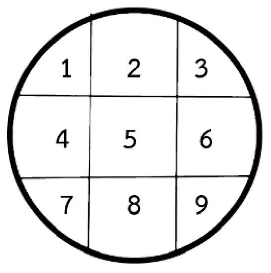 Figure 2. Fixed location of the nine illuminance measurements at the top and bottom end positions of light tube.