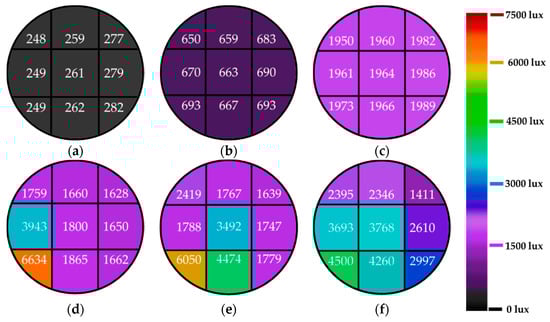 Figure 4 presents the internal illumination contours of the top positions of the aluminum alloy light tube, with a diameter of 0.25 m, at various incident light angles. A color map on the two-dimensional horizontal plane demonstrates the illuminance distribution at the top position of the hollow light pipe. The illumination of the top position was between 248 lux and 282 lux at the incident light angle of 0°, which was uniformly distributed. While increasing the incident light angle from 0° to 30°, the illuminance distribution at the top position was nearly uniform in value. When the incident light angle increased from 30° to 80°, the internal illuminance distribution became nonuniform in some positions, as exhibited in Figure 4d–f. As the incident light angle increased from 0° to 80°, the internal illumination distribution at the top end changed in each condition. The illuminance value at each position on the top increased in value when the incident angle increased, as displayed in Figure 4.