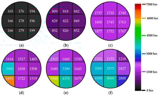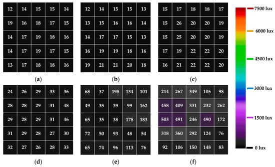 Figure 12. Illuminance distribution on the floor from the aluminum alloy light tube at the incident angles of (a) 0°, (b) 15°, (c) 30°, (d) 45°, (e) 60°, and (f) 75°.