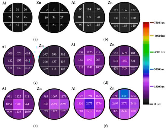 Figure 6 demonstrates the illumination levels on the bottom of both aluminum alloy and zinc alloy hollow light pipes, with the same diameter of 0.25 m and tube length of 0.5 m at different incident angles. When using the aluminum alloy hollow light pipe, the illumination was between 12 lux and 52 lux at the incident light angle of 0°, which was uniformly distributed. The zinc alloy tube had illumination values between 2 lux and 34 lux with a nonuniform illuminance distribution at the incident angle of 0°. When the incident angle was increased from 0° to 30°, the illuminance distribution at the bottom of both types was nearly uniform. When the incident light angle increased from 30° to 80°, the illuminance distribution became nonuniformly distributed, as exhibited in Figure 6d–f. The illumination distribution for both aluminum alloy and zinc alloy tubes at the bottom varied when the incident light angle was changed from 0° to 80°. The illuminance at the bottom increased with the increase of the incident angle from 0° to 80°, as illustrated in Figure 6.
