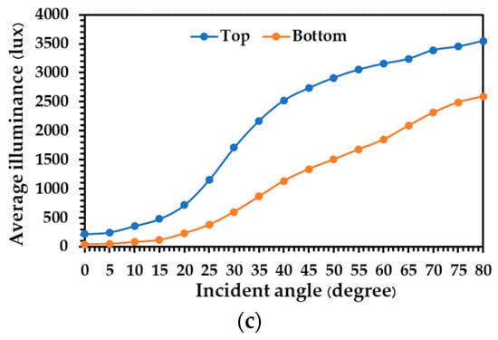 Figure 8. Average illuminance at the top and bottom tube position of zinc alloy tube with diameters of (a) 0.20 m, (b) 0.25 m, and (c) 0.30 m.