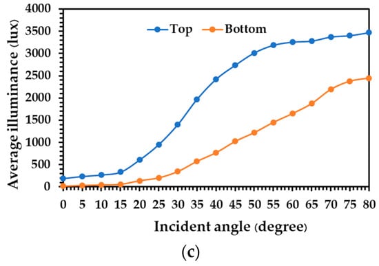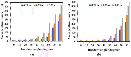 When considering the zinc alloy tube with a diameter of 0.20 m, the average illuminance on the floor increased from 9 lux to 20 lux when the incident light angle increased from 0° to 80°. For the cases of the diameters of 0.25 m and 0.30 m, the average illuminance values on the floor were similar to those of the 0.20 m diameter tube, as illustrated in Figure 14b. The average illuminance on the floor with the zinc alloy tube with a diameter of 0.25 m increased between 16 lux and 302 lux, and that of the 0.30 m diameter tube increased between 6 lux and 400 lux when there was an increase in the incident angle from 0° to 80°.