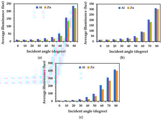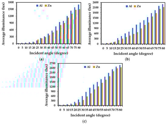 Comparing the aluminum and zinc alloy tubes at the same diameter of 0.20 m, the average illuminance on the floor from the aluminum alloy tube was higher than that of zinc alloy tube at all incident light angles, as shown in Figure 15a. The aluminum alloy tube was more than 7% brighter when compared with zinc alloy tubes at incident light angles between 0° and 80°. For the diameters of 0.25 m and 0.30 m, an increase of the average illuminance on the floor from the aluminum alloy tube was more than 3% when compared with that of zinc alloy tube at all incident light angles, as shown in Figure 15b,c. This indicates that the aluminum alloy tube has more illuminance efficiency than zinc alloy tubes at each diameter size and incident light angle.