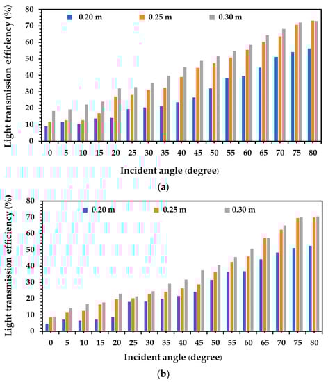 When using the zinc alloy tube with a diameter 0.20 m and a height of 0.50 m, light transmission increased from 4.7% to 52.5% when the incident light angle increased from 0° to 80°. For the diameters of 0.25 m and 0.30 m, the light transmission performance was similar to those of the 0.20 m diameter tube, as illustrated in Figure 10b. Light transmission performance of the zinc alloy tube with a diameter of 0.25 m increased between 8.7% and 69.9%, and that of 0.30 m tube increased between 9.1% and 70.6% with an increase of the incident light angle from 0° to 80°. This increase of light transmission performance is achieved from an increase of the incident light angle, demonstrating the reduced number of reflections within the light tube surfaces, which leads to minimal losses of luminous intensity.