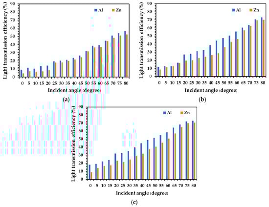 All of the luminous intensity values at the top and bottom ends of both aluminum alloy and zinc alloy tubes were considered to calculate the light transmission performance of the tubes, as exhibited in Figure 10. Light transmission of the vertical aluminum alloy tube with a diameter of 0.20 m increased from 9.1% to 56.3% when the incident light angle to the tube increased from 0° to 80°, as shown in Figure 10a. When considering the diameters of 0.25 m and 0.30 m, the light transmission performance was similar to those of the 0.20 m diameter tube, as illustrated in Figure 10a. Light transmission performance of the aluminum alloy tubes with a diameter of 0.25 m increased between 11.8% and 73.3%, and that of the 0.30 m tube increased from 18.3% to 73.1% when the incident light angle increased from 0° to 80°.