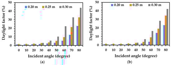 Comparing the diameter variation of both aluminum alloy tubes and zinc alloy tubes, the daylight factor was similar and between 0.7% and 2.9% when the tube diameter increased from 0.20 m to 0.30 m at the incident light angles of 0°, 5°, 10°, 15°, 20°, 25°, and 30°. For the incident light angles to the tube of 35°, 40°, 45°, 50°, 55°, 60°, 65°, 70°, and 80°, the daylight factor of both aluminum alloy tube and zinc alloy tube increased with an increase in diameter from 0.20 m to 0.30 m, as illustrated in Figure 16. This observation demonstrated that the aluminum alloy tubes can provide a better daylight factor compared with zinc alloy tubes for each condition.
