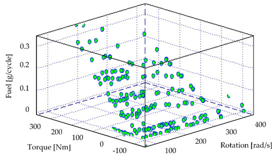 Fuel consumption measurement points for one fuel injection cycle as a function of engine rotational speed and engine torque used for the construction of the neural model.
