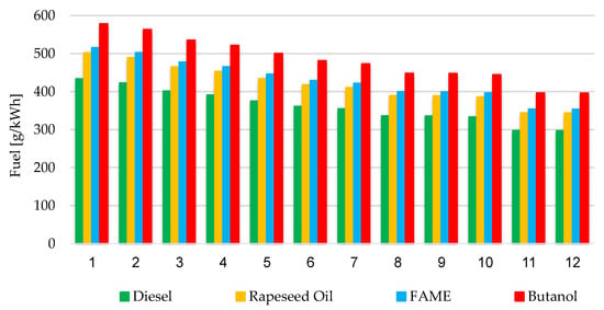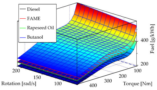 Figure 4 presents the flow of the instantaneous values of the specific fuel consumption as a function of the engine rotational speed and the engine-generated torque for 4 types of fuels used in the simulation (diesel, FAME, rapeseed oil, butanol).
