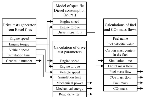 Based on the analysis of the data created with the use of the “Gearshift Calculation Tool” programme, the results of the process of optimization of the neural network structures and the properties of the biofuels in question, a driving test simulator was developed in Scilab 6.1.0. The simulator consists of blocks responsible for individual functionalities, whose connection schematic is presented in Figure 5: