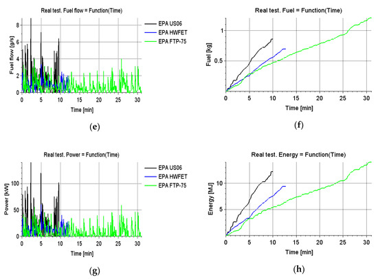 The results of the simulation work for the processed data from EPA tests for the 2013 Mercedes E350 vehicle: (a) Waveforms of the instantaneous vehicle speed values; (b) Waveforms of the instantaneous values of the distance travelled by the vehicle; (c) Waveforms of the instantaneous vehicle engine speed values; (d) Waveforms of the instantaneous values of torque generated by the vehicle engine; (e) Waveforms of the instantaneous values of the fuel stream powering the vehicle engine; (f) Waveforms of the instantaneous fuel consumption values for the vehicle; (g) Waveforms of the instantaneous values of power generated by the vehicle’s engine; (h) Waveforms of the instantaneous values of mechanical energy generated by the vehicle engine.