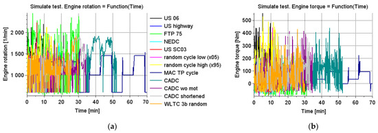 After the complete information about the vehicle has been entered, the program enables the generation of the necessary waveforms in the time domain, which enable the determination of the instantaneous operating parameters of the analyzed programme. Then, these waveforms were exported to the Excel file format. For further stages of the simulation, the instantaneous waveforms of the following quantities were used: simulation time [s]; engine rotational speed [rpm]; power generated by the engine [kW]; torque generated by the engine [Nm]—a value calculated on the basis of engine rotational speed and engine power; gear number [-]; vehicle speed [kph].