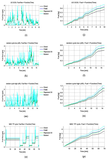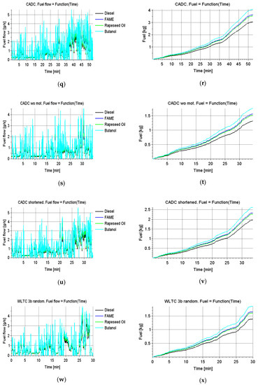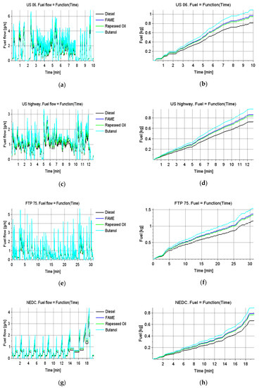 The following are the processes of independent simulations of a selected 2013 Mercedes E350 vehicle in the applied driving tests with fuels changing (Diesel, FAME, rapeseed oil, butanol):