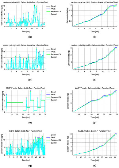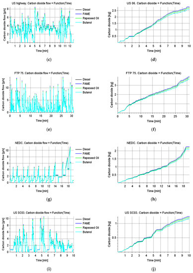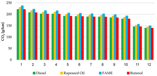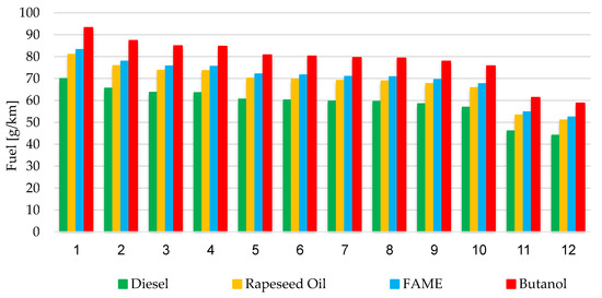 The above activities were necessary to simulate the operation of the selected vehicle in driving tests, in order to obtain the amount of CO2 emissions and fuel demand for the fuels used (diesel oil, FAME, rapeseed oil, and butanol).