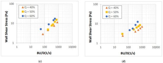 Shear stress vs. nominal Newtonian shear rate for: (a) 5%, (b) 9%, (c) 14%, and (d) 18% CaCl2 foams.