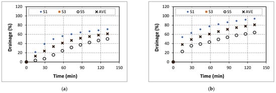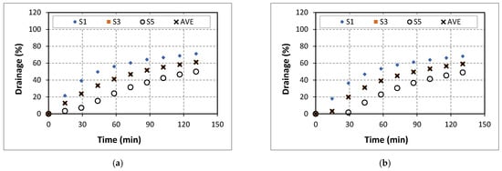 Final average drainage (AVE) vs. CaCl2 content for different foams: (a) 40% and 50%, and (b) 60%.