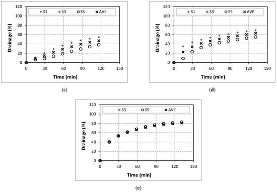 Drainage of 40% quality aqueous foam at different CaCl2 concentrations: (a) 0% wt., (b) 5% wt., (c) 7% wt., (d) 9% wt., (e) 14% wt.