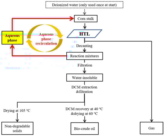 For the first HTL experiment, 6 g dried stalk and 54 g deionized water were added to a high–pressure reactor (Parr 4575A, Moline, IL, USA). Nitrogen was passed through the reactor for more than three times to remove air. The speed was set as 300 rpm. Then the pre–mixing was started. After that, the air–tightness of the reactor was observed for 30 min without leakage, then the temperature was increased to 300 °C at the rate of 10 °C/min and then kept for 30 min. The experiment was repeated three times under the same conditions for each group. Immediately after the reaction was completed, the heating was stopped and the reactor was cooled to room temperature for 50 min by using a chiller. The product separation and collection procedure was shown in Figure 1. The gas was discharged and the mixed products were filtered to obtain the water–insoluble and aqueous phase products (AP). The collected aqueous products were filtered through a 0.45 µm membrane and then the indicators were measured. The water–insoluble matter was extracted with dichloromethane (DCM) for further separation. The DCM–insoluble matter was dried at 105 °C for 24 h and defined as nondegradable solids (NDS). After drying, it was weighed to obtain the exact weight of the NDS; the obtained DCM soluble matter was defined as the Bio-crude oil (BO). The DCM was recovered by rotary evaporation at 40 °C and dried under vacuum (60 °C, vacuum <133 pa) for 8 h to remove water and then accurately weighed to obtain the weight of BO.