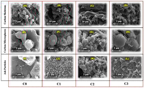 SEM showed that a distinct carbon skeleton, carbon microsphere structure, deposited metal salt particles, and microscopic morphology of the nondegraded portion of the stalk appeared in the NDS (Figure 2). No significant carbon skeleton structure (Figure 2A) but a higher number of carbon microspheres (Figure 2E) appeared in group C0. The carbon microspheres were formed in groups C1 and C2, along with the appearance of a carbon skeleton similar to the pore structure in the middle of the microspheres (Figure 2B). Irregular agglomerates started appearing around the carbon microspheres in group C2 (Figure 2G), which may be due to the deposited ash. The particle size of the carbon microspheres of the C3 group was further enlarged (Figure 2H), with the observance of concave porous structures and deposited fine particles (Figure 2L). The formation of the carbon microsphere structures is associated with the aromatization of sugars generated by cellulose breakdown []. This also confirms that the aqueous phase recycling promotes the decomposition of lignin and a distinct carbon skeleton structure is formed through intermolecular interactions (Figure 2A–D). The formation of carbon skeleton and carbon microsphere (Figure 2A–H) directly proves the existence of carbon deposition effect.