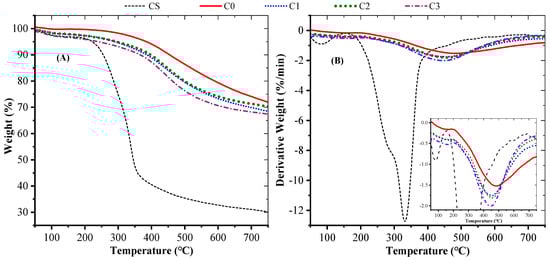 The thermal stability of NDS was correlated with its potential for continued hydrothermal degradation. Thermogravimetric analysis of the corn stalk, as well as the NDS, was carried out, with the results of thermal gravity (TG) and derivative thermal gravity (DTG) being shown in Figure 3. By comparing the thermal weight loss characteristics of the corn stalk with the remaining NDS after its HTL, it was found that when the temperature reached 800 °C, about 70% of the material in corn stalk was transformed, while only 20–30% of the material in NDS. The number of nondegradable substances increased significantly. By comparing the unrecycling C0 group with the cumulative recycling groups, it was found that the nondegradable material after recycling was less than that of unrecycling, decreasing from 70.52% in group C0 to 66.83% in group C3. The changes in C1 and C2 groups were not significant, and the changes in at this time were also not significant (Table 4), indicating that the carbonation degree of C1 and C2 groups was almost the same. From Figure 3B, it can be seen that two weight loss rate peaks were observed in corn stalk. The maximum weight loss rate was about 15.81%/min at around 338 °C. At this stage, it is mainly the pyrolysis of cellulose and hemicellulose. In general, the degradation temperatures of these two species are between 150–350 °C and 275–350 °C, respectively, and the peaks overlap with each other. However, there is only one peak of weight loss rate in NDS and moves toward a lower temperature as the recycling progresses. The maximum weight loss from C0 to C3 occurred at 486.1 °C, 455.8 °C, 451.4 °C, and 448.4 °C, and the maximum weight loss rate of the C3 group was about 2%/min, which was greatly reduced compared with the stalk. It shows that cellulose and hemicellulose are completely decomposed after aqueous phase recycling, with the occurrence of even some lignin decomposition []. Though there is slight decrease of the thermal stability of NDS, it can still be degraded at around 450~500 °C.