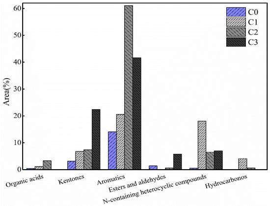 The components of Bio-crude oil include organic acids, ketones, aromatics, esters, aldehydes, and N–containing heterocyclic compounds (Figure 4). The detailed name and composition are shown in Figure S1.
