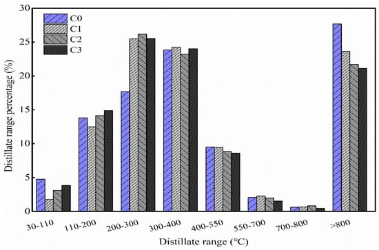 The boiling point distribution of Bio-crude oil obtained by thermogravimetric analysis in this study is shown in Figure 5. Thermogravimetric analysis can be considered as a miniature “distillation” [,] that can determine the volatility characteristics of the Bio-crude fraction [].