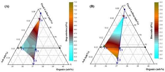 From Figure 6A, as one moves almost in a straight line from C0 to C3, the ash and organic residues increased in equal proportion, the fixed carbon content decreased, increased but still below C0. As one moves from C1 to C2, the fixed carbon content was almost unchanged, while the ash enrichment was significant and accompanied by a decrease in organic matter. At this time, decreased slightly but not significantly. This indicates that the change in is most closely related to the change in fixed carbon content. In addition, the enrichment of ash hindered the heat and mass transfer of the organic components in the reaction process, which also negatively affects . The hydrothermal degradation process was weakened after the recycling compared to the unrecycling, but was rebounded after the third recycling.