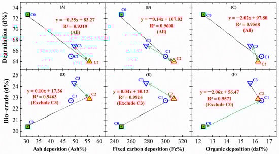 From Figure 6B, as one moves almost in a straight line from C0 to C3, the increases significantly. As one moves from C1 to C2, the increases slightly. It is speculated that certain metal salts such as K and Ca in the ash plays the role of catalysis to promote oil production []. The aqueous phase recycling not only promotes the oil production, but also promotes the carbonization process. Reducing carbonization process is beneficial to oil formation.