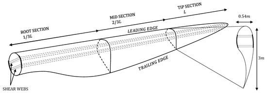 Dimensions of a sample 61.5 m Wind Turbine Blades (WTB), using the NREL 5MW blade as a reference [67].