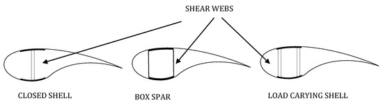 Cross-section of the WTB with different shear web formations.