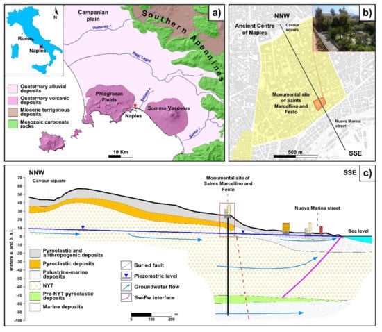 Figure 1a). It is bordered to the east by the active volcanic district of the Phlegraean Fields, and to the west by the Sebeto valley and Somma-Vesuvius volcano. The stratigraphic setting of the city mainly consists of Neapolitan Yellow Tuff (NYT; ~15 ka BP; [