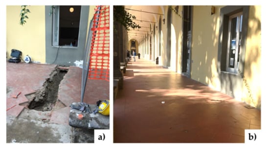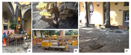 Figure 3 show the state of the places, regarding the cloister and the portico, before and after the intervention, highlighting how the excavation and drilling processes did not alter the original architectural layout.