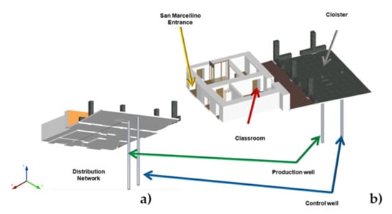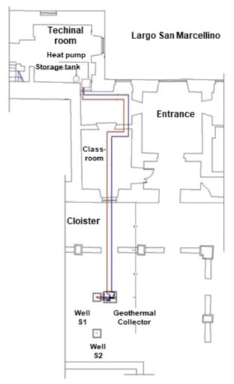 Figure 6 displays the overall scheme of the geothermal system, with the location of the two wells (S1 and S2) and the classroom that is served by the system (Classroom ASGU-Unina Student Association of Geological Sciences), and on which the tests have been carried out. Moreover,