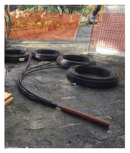 Figure 5 shows the double U probes installed at the SM&F site. To facilitate the installation of the geothermal probes, a steel ballast weighing 30 kg was used, with a length of 670 mm and diameter of 80 mm. The weight was applied to the geothermal probe using a set of flat steel bars, to maintain the verticality of the probes. The probes used were manufactured by the German company REHAU, and comply with UNI 10910 and DIN 8074/8075 (type RAUGEO PE-RC duo double U probe made of PE 100-RC material).