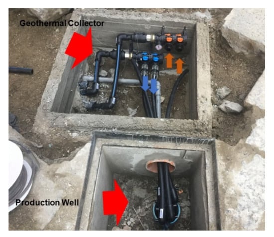 Figure 6 shows the location of the two wells, the geothermal collector, the distribution network, and the heat pump.