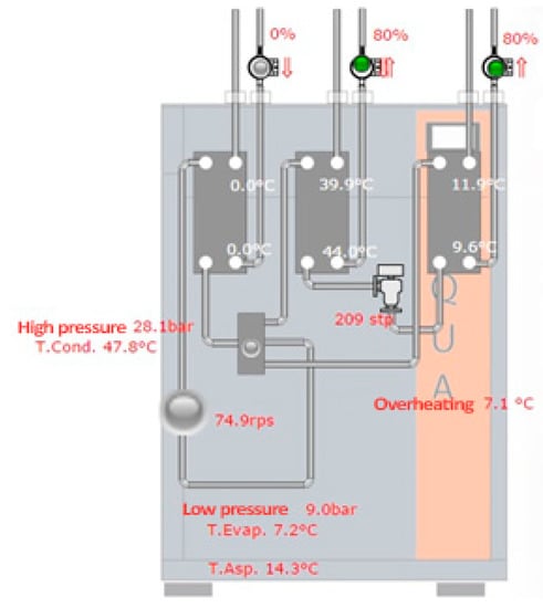 Figure 9 shows the main data monitored by the sensors installed on the heat pump. The monitored parameters are: (i) temperature at entrance and exit of the primary and secondary heat exchangers; (ii) speed of the pumps; (iii) pressure values at the entrance and exit of the compressor; (iv) operating power of the compressor; (v) the opening of the thermostatic valve.