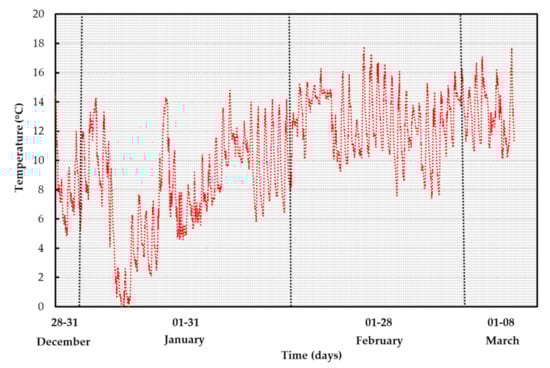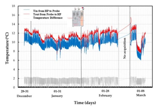 Figure 10, together with the temperature difference. The reference period is 8 December 2016 to 8 March 2017. It can be noticed that the average inlet temperature into the probes is equal to 10.9 °C, while the average outlet temperature from the probes is equal to 12.4 °C, and the average temperature difference is equal to 1.5 °C.