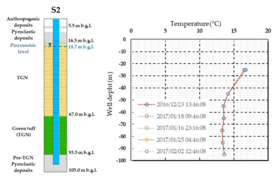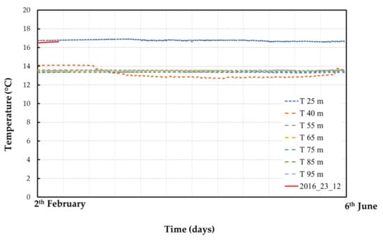 Figure 13 shows the stratigraphy of the ground and temperatures distribution within the control well (S2) over time. In particular, the first line (dotted red) refers to a day where the plant was not yet in operation, while the other lines refer to the plant in operation. It is clear from this figure that the geothermal system did not have a significant influence on the ground temperature surrounding the production well (S1).