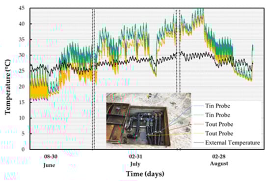 Figure 14, together with the temperature difference. In particular, the data acquired directly on the probes have been reported. The reference period is from 8 June 2018 to 28 August 2018.