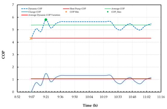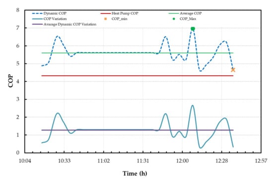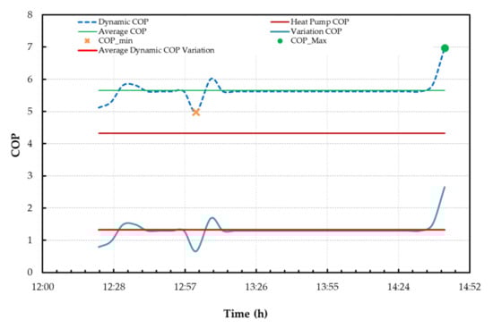 Figure 20 displays the dynamic COP values, the COP certified by the manufacturer, equal to 4.32, the average value of the dynamic COP, and its minimum and maximum values. The reference period is the one referred to by letter C above (01/02/2017 from 12:22:44 to 14:42:43). The experimental analysis shows that the actual values were larger than the COP value certified by the manufacturer. The minimum COP value of 4.98 was detected at 16:42:52, while the maximum value of 6.98 was detected at 16:12:19. The average value is 5.65. These values are all larger than the COP declared by the manufacturer.