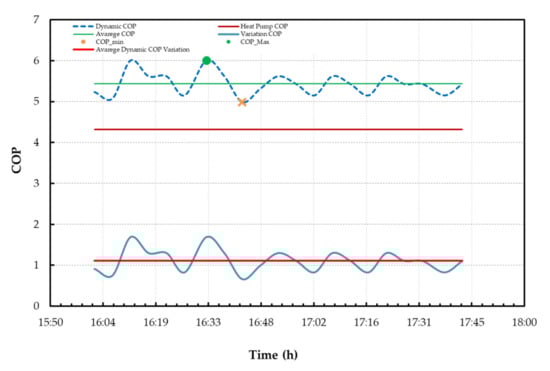 Figure 19 displays the dynamic COP values, the COP certified by the manufacturer, equal to 4.32, the average value of the dynamic COP, and its minimum and maximum values. The reference period is the one referred to by letter B above (30/01/17 from 16:02:29 to 17:42:59). The experimental analysis shows that the actual values are larger than the COP value certified by the manufacturer. The minimum COP value of 4.98 was detected at 16:42:52, while the maximum value of 6.01 was detected at 16:12:19. The average value is 5.43. These values are all larger than the COP declared by the manufacturer.