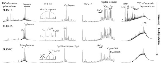 Recently, a suite of genetically related crude oils from the Miaoxi Depression of the Bohai Bay Basin, China, subjected to light to very severe biodegradation, was studied by Cheng et al., analyzing the effects of biodegradation on saturated and aromatic hydrocarbons [38,39,40]. A subset of three crude oils from the archive were used in this study. They comprise a reference oil (PL15-1B, slightly biodegraded) and two severely biodegraded oils (PL15-1A and PL15-8C) with increasing extents of biodegradation (Table 1). Figure 1 shows the distribution of biomarkers and aromatic hydrocarbons in the crude oils. n-Alkanes were removed, and isoprenodis, tricyclic terpanes, hopanes, steranes, and aromatic hydrocarbon were found intact in the PL15-1B oil, suggesting slightly biodegradation. In the PL15-1A oil, n-alkanes and isoprenodis were removed, naphthalenes and phenanthrenes were considerably depleted, hopanes and regular steranes were significantly altered, but tricyclic terpanes were intact, suggesting severe biodegradation (level 7 based on the Peters and Moldowan biodegradation scale [3]. The PL15-8C oils was more severely biodegraded (level 8), as n-alkanes, isoprenodis, hopanes, steranes, and aromatic hydrocarbon were almost completely removed, and C19–C23 tricyclic terpanes were considerably altered.