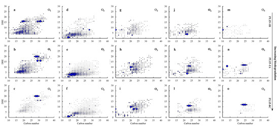 Iso-abundance plots of DBE versus carbon number of O1–O5 classes in the crude oils. The size of circles represents the relative abundance of the species in the spectra. (a–c), (d–f), (g–i), (j–l), and (m–o) show the distribution of O1–O5 classes for the PL15-1B, PL15-1A, and PL15-8C oils, respectively.
