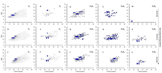 The carbon number and DBE value of the N1O3 class vary significantly from the three analysed samples (Figure 6m–o). For the PL15-1B oil, the N1O3 species are in the range of C10–C14 with DBE values of 2–5; in the PL15-1A oil, they range from C14–C29 with DBEs of 6–15; and in the PL15-8C oil, they range from C19–C28 with DBEs of 7–13. In the two severely biodegraded oils, C19H26N1O3 and C21H30N1O3 (DBE = 7) became dominant (Figure 6n,o). The occurrence of the N1O3 species with different carbon numbers and DBE values in the severely biodegraded oils compared with the reference PL15-1B oil indicate that some species in this class were altered, while some components were generated during severe biodegradation.